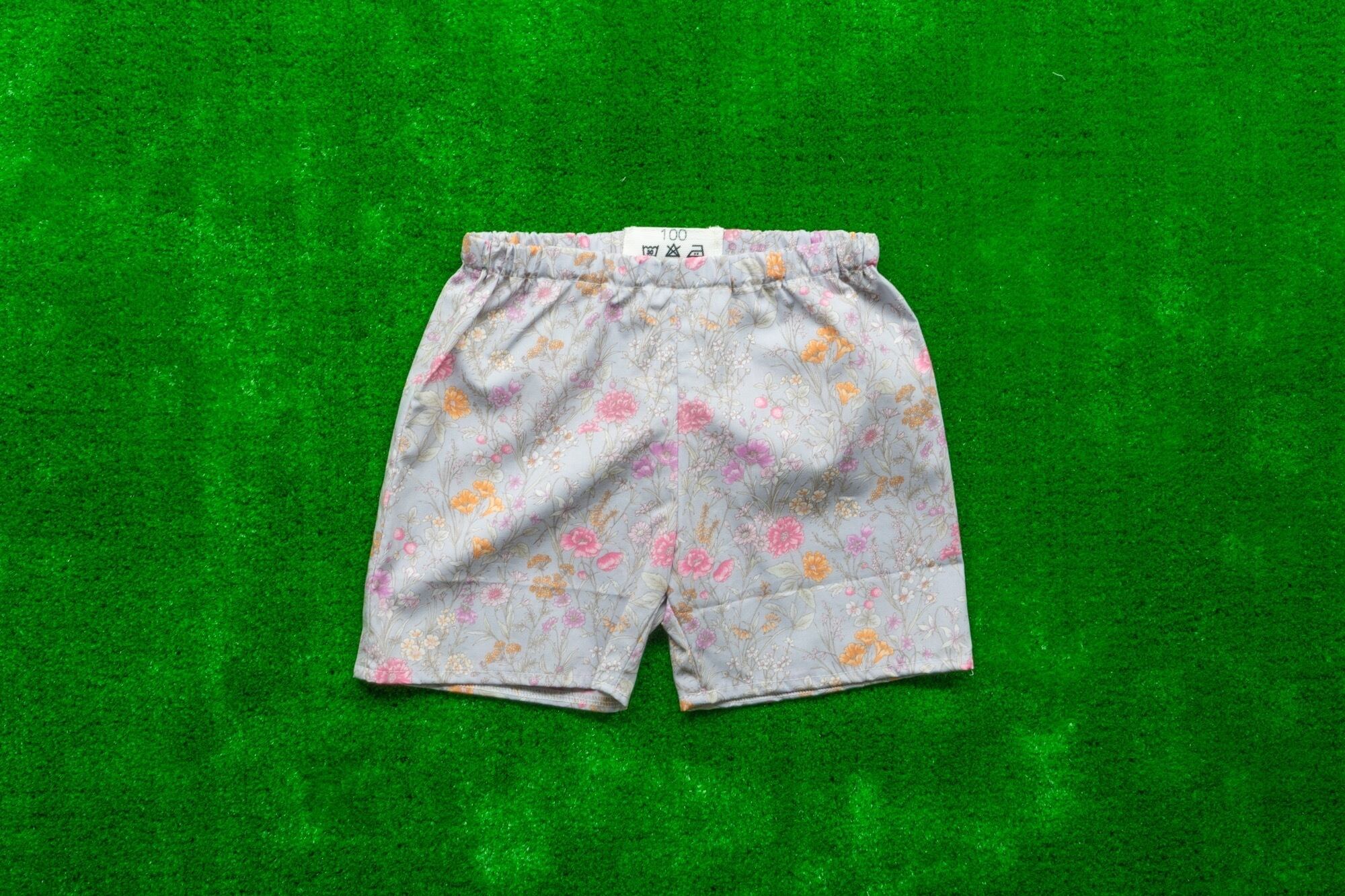 英国の素敵なお庭のような花が繊細なタッチで描かれている。うすい紫ベースが超絶かわいいガーリーな花柄。薄手のコットン100 サイズ:90、100